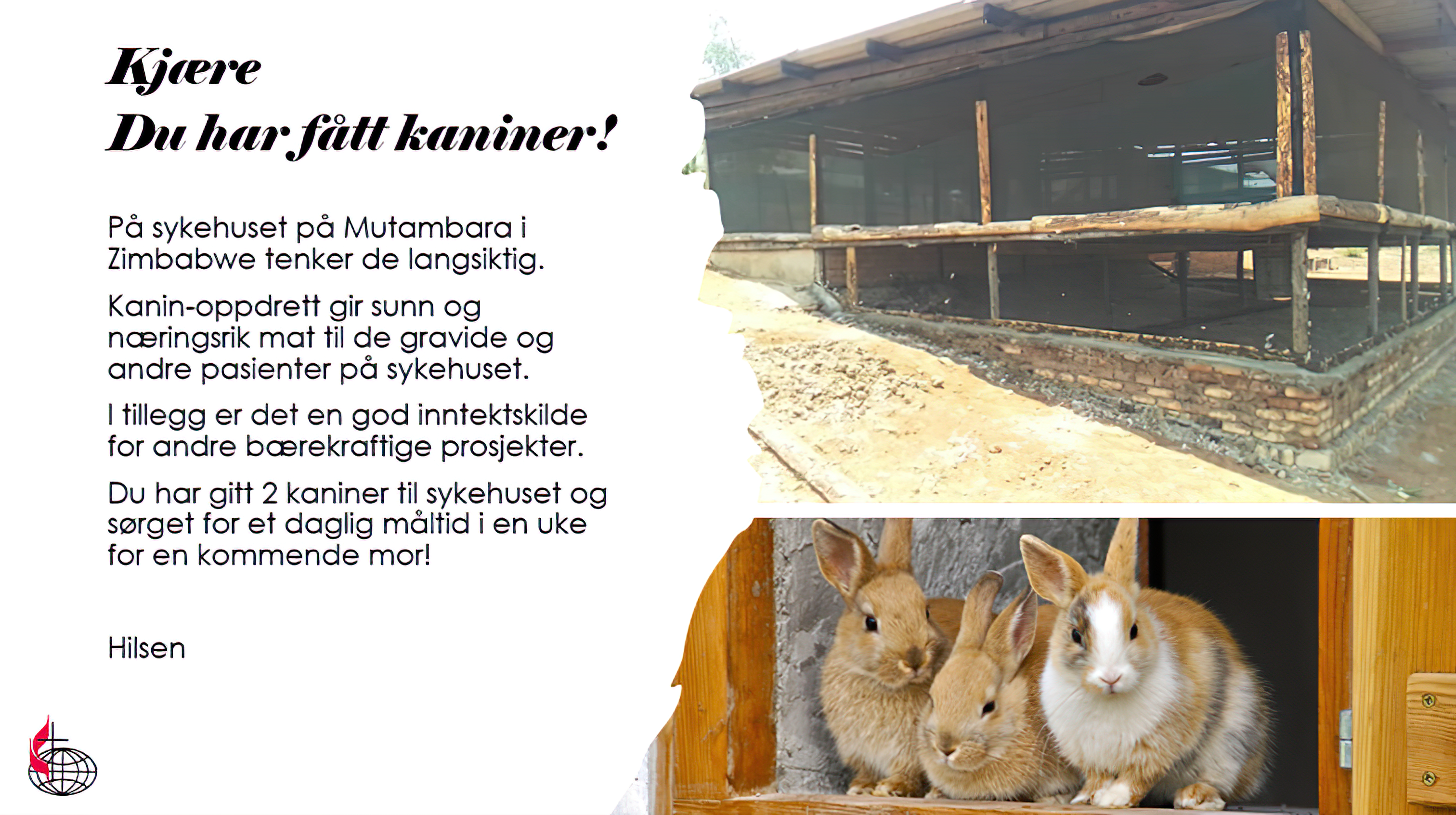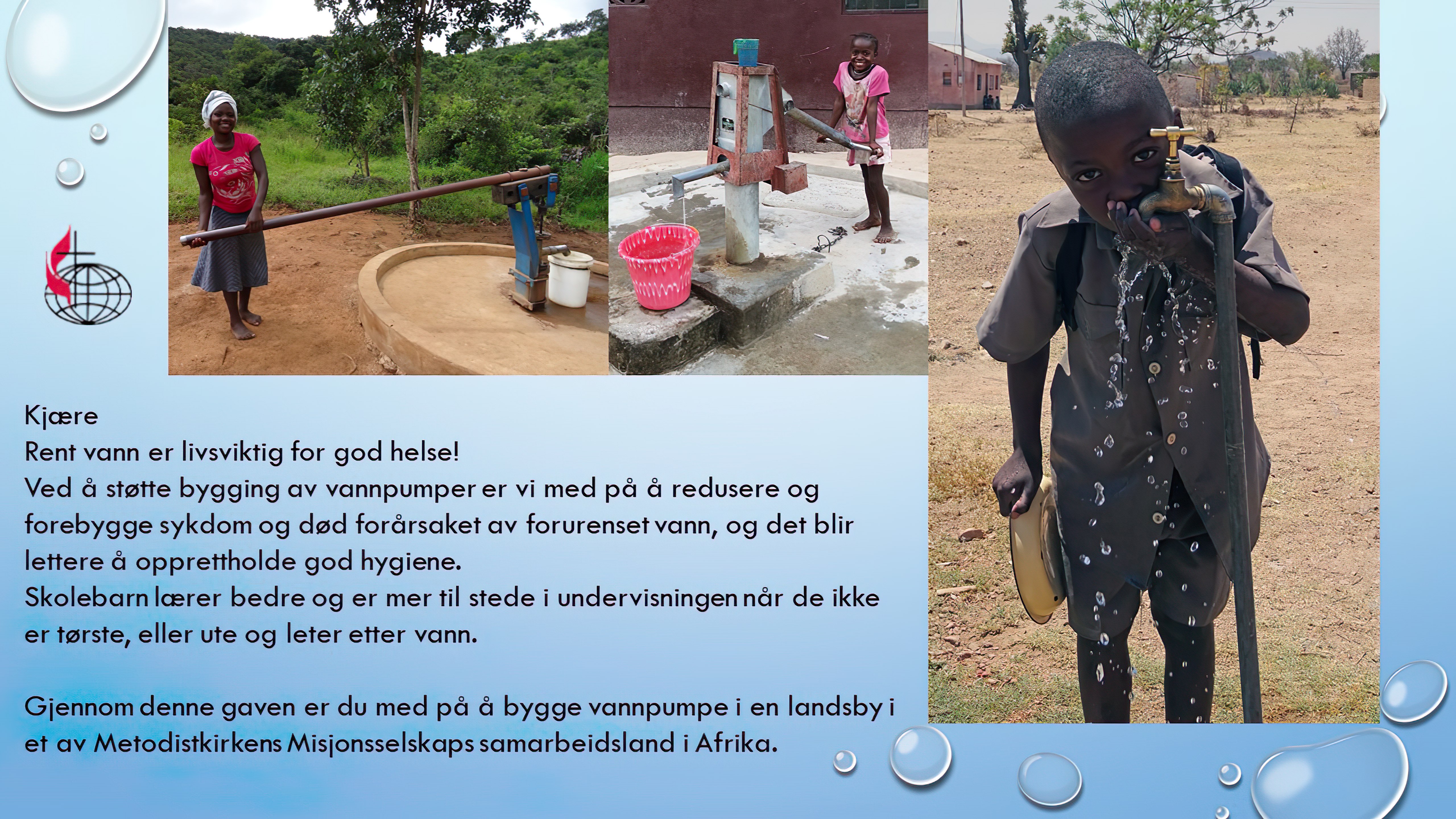 Gaver som gjør verden litt bedre! Det nærmer seg jul! Ved å kjøpe gavekort i vår nettbutikk vil gaven du gir bety mye, for mange! Vi har i mange år gitt mulighet for å gi alternative gaver; det er allerede blitt en hyggelig tradisjon! Det er så mange av oss som har "alt", men vi liker likevel å bli husket og tenkt på. Derfor er det en glede å kunne få, - og gi, en meningsfull gave, ved at noen som virkelig trenger det blir den egentlige mottakeren! Her presenterer vi Metodistkirkens Misjonsselskaps gavekort! Vi håper at mange vil finne glede i å gi bort en gave med håp og framtid; en gave som gjør verden litt bedre! Flere gaver finner du ved å trykke på lenken nederst på siden og gå inn i nettbutikken. Grisunger, kyllinger og kaniner på Mutambara For å få ned spedbarns- og barseldødeligheten i Zimbabwe, skal alle førstegangsfødende og de som forventer komplikasjoner komme til fødeklinikken noen uker før fødselen. Her bor de på Waiting mothers' shelter, og en sånn ordning har vi også på Mutambara. Her vil de få den hjelpen de trenger. De gravide lager selv maten de spiser, men meningen er at de skal få mat på Mutambara Hospital, og slippe å bekymre seg for hvordan de skal skaffe mat. Denne bekymringen ligger nå på ledelsen på Mutambara, og de har satt i gang mange tiltak for bærekraftig forsyning av mat til de gravide. Foruten kjøkkenhage med grønnsaker som tomater og mais, driver de med oppdrett av grisunger, kyllinger og kaniner 4 kyllinger på Mutambara koster 100 kroner 2 kaniner på Mutambara koster 100 kroner 1 grisunge koster 300 kroner Kirkebygging i Gbason Town, Liberia Kirkelivet er veldig sentralt i Afrika, og i mange landsbyer finnes det en Metodistkirke. I landsbyen Gbason Town i Liberia ble kirken ødelagt etter krig og uro, men også vær og klima har gjort sitt. Det skal nå bygges en helt ny kirke sammen med lokalbefolkningen. Denne gaven koster 200 kroner Vannpumper Rent vann er livsviktig for god helse! Ved å støtte bygging av vannpumper er vi med på å redusere og forebygge sykdom og død forårsaket av forurenset vann, og det blir lettere å opprettholde god hygiene. Skolebarn lærer bedre og er mer til stede i undervisningen når de ikke er tørste, eller ute og leter etter vann. Når det bygges vannpumpe i landsbyen, slipper kvinner og barn å gå flere timer til nærmeste vannkilde. De kan bruke tiden sin på andre ting og utsettes heller ikke for faren for overgrep på veien. Bidrag til vannpumpe koster 250 kroner Skolesekk til barn i Sierra Leone og Liberia Gjennom Partnership in Development programmene våre, bygges det flere skoler. I Vest Afrika er det mange barn som er foreldreløse etter ebolakatastrofen, eller har foreldre som ikke har råd til å sende dem på skolen. En skolesekk, med utstyr vil gjøre det mulig for flere barn å gå på skolen. Utdannelse gir barna sjansen til å komme seg ut av fattigdom og sikre seg et bedre liv! En skolesekk koster 150 kroner Kjøp gavekort i Metodistkirkens nettbutikk