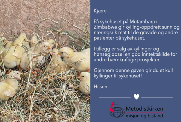 Gi mat og trygghet til gravide kvinner på Mutambara Hospital i Zimbabwe. For å få ned spedbarns- og barseldødeligheten, skal alle førstegangsfødende og de som forventer komplikasjoner komme til fødeklinikken noen uker før fødselen. De gravide lager selv maten de spiser, og ledelsen på Mutambara har satt i gang mange tiltak for bærekraftig forsyning av mat til de gravide. Et kull kyllinger koster 150 kr, en grisunge 300 kr.